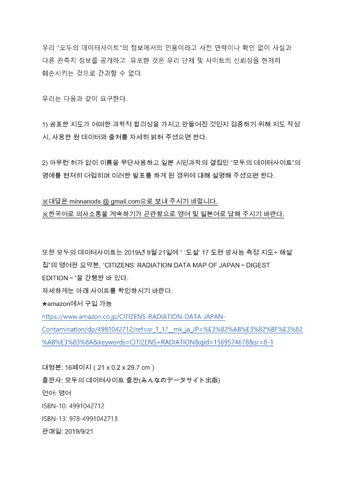 韓国「共に民主党」が本当に放射能の心配をするなら、日本政府をあのような地図で糾弾するのではなく、まずは私達の問い合わせの内容に対して返事をし、正しい理解のために動いて欲しいと願っています。