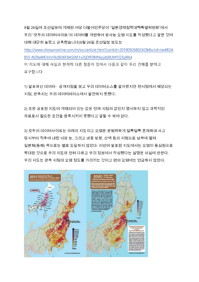 9月26日付で朝鮮日報に掲載された、与党「共に民主党」が「日本経済侵略対策特別委員会」において、私達「みんなのデータサイト」のデータを改変して放射能汚染地図を作成したと述べたことについて大変驚き、困惑しています。