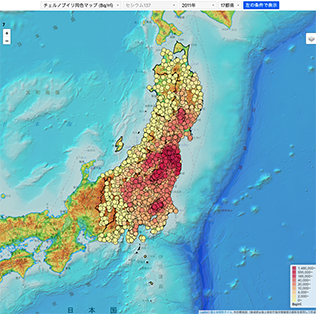 放射性物質のベクレル数を色で表す地図を表示することができるよ。